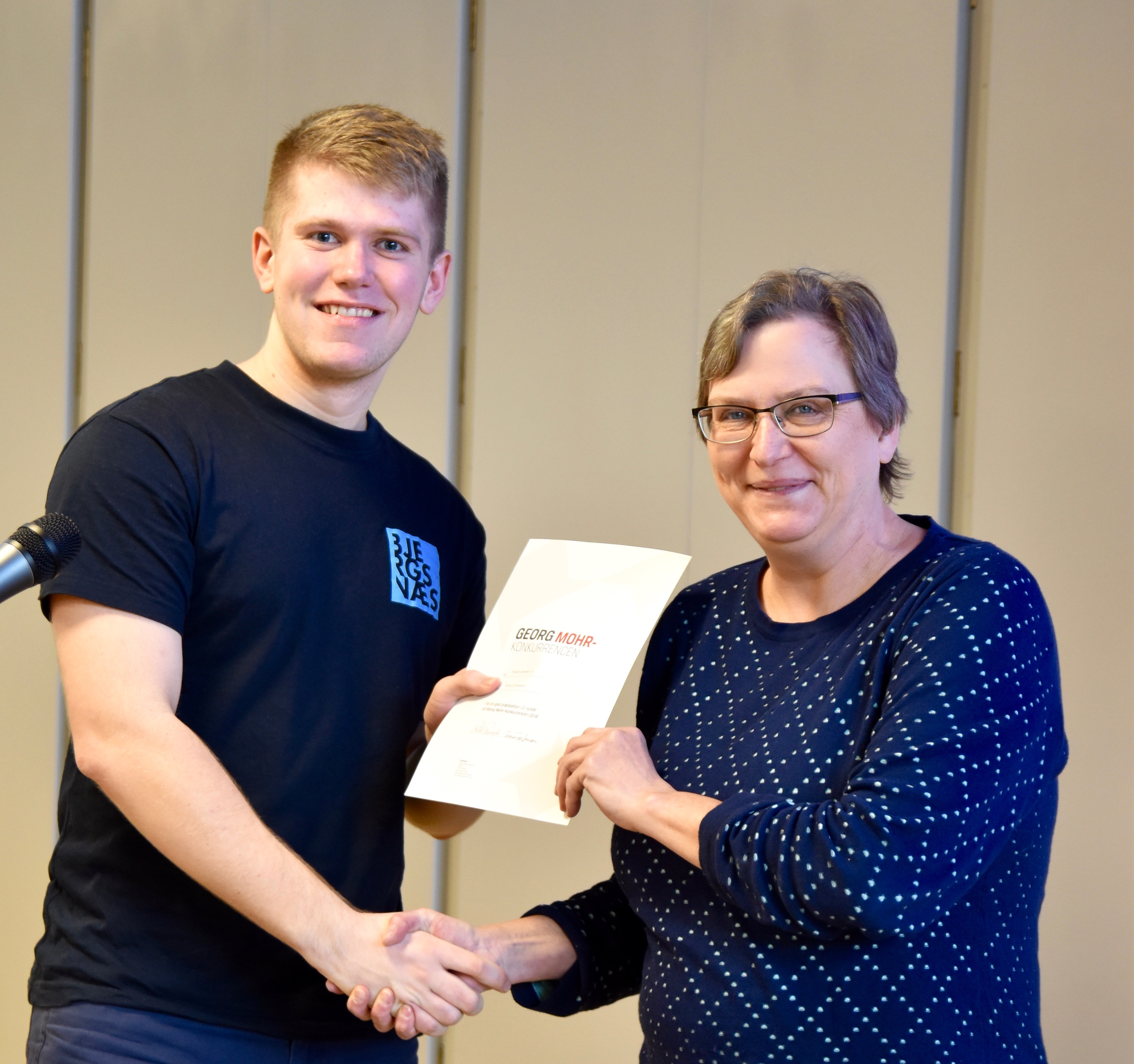 Der var god grund til store smil hos både lærer og elev, for på dagens fællessamling kunne Lone overrække et flot diplom til Ruben Lindgaard Løber Pedersen fra 1.c. I løbet af de seneste måneder har han deltaget i Georg Mohr-Konkurrencen, som er en landsd ...