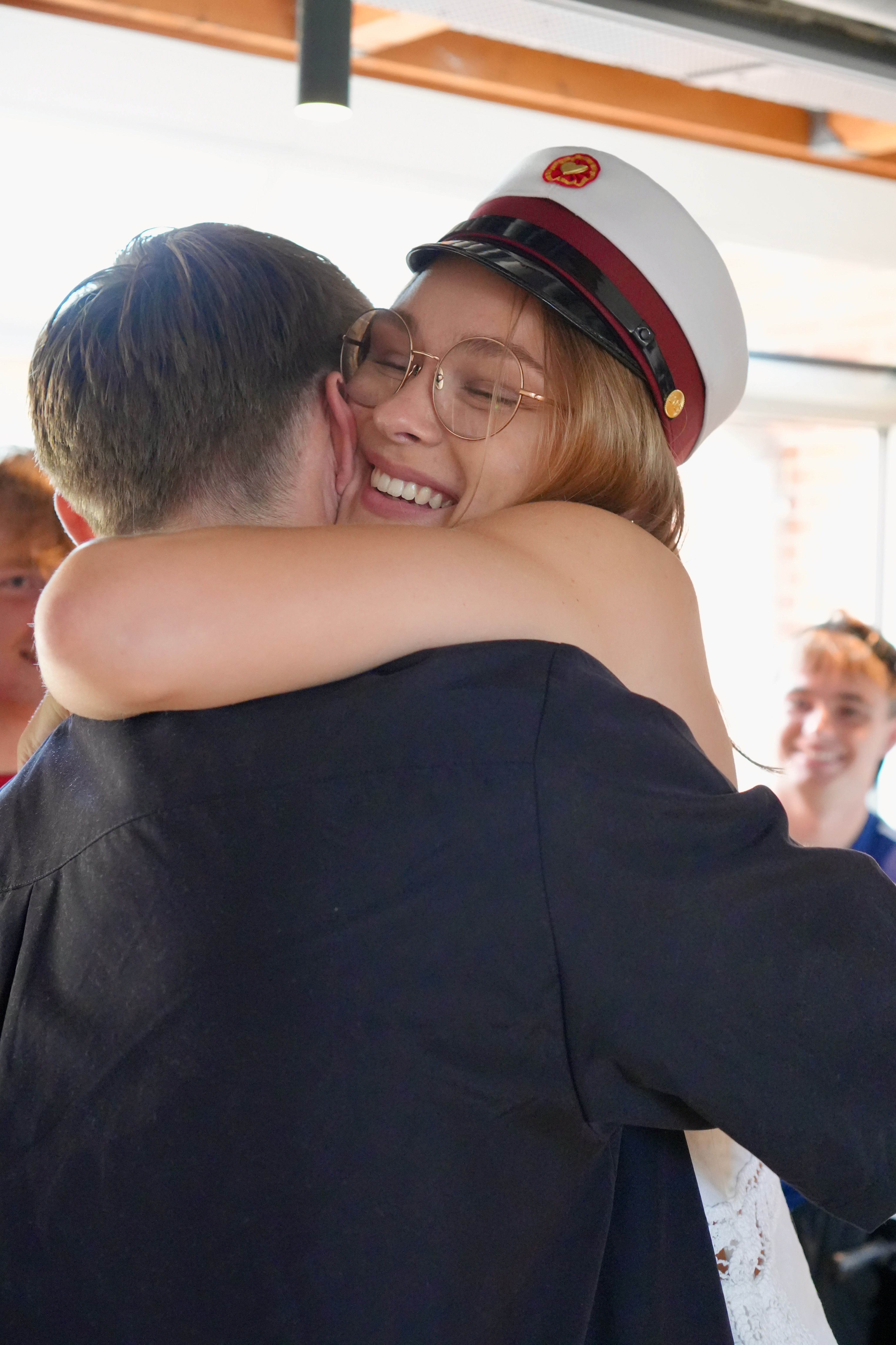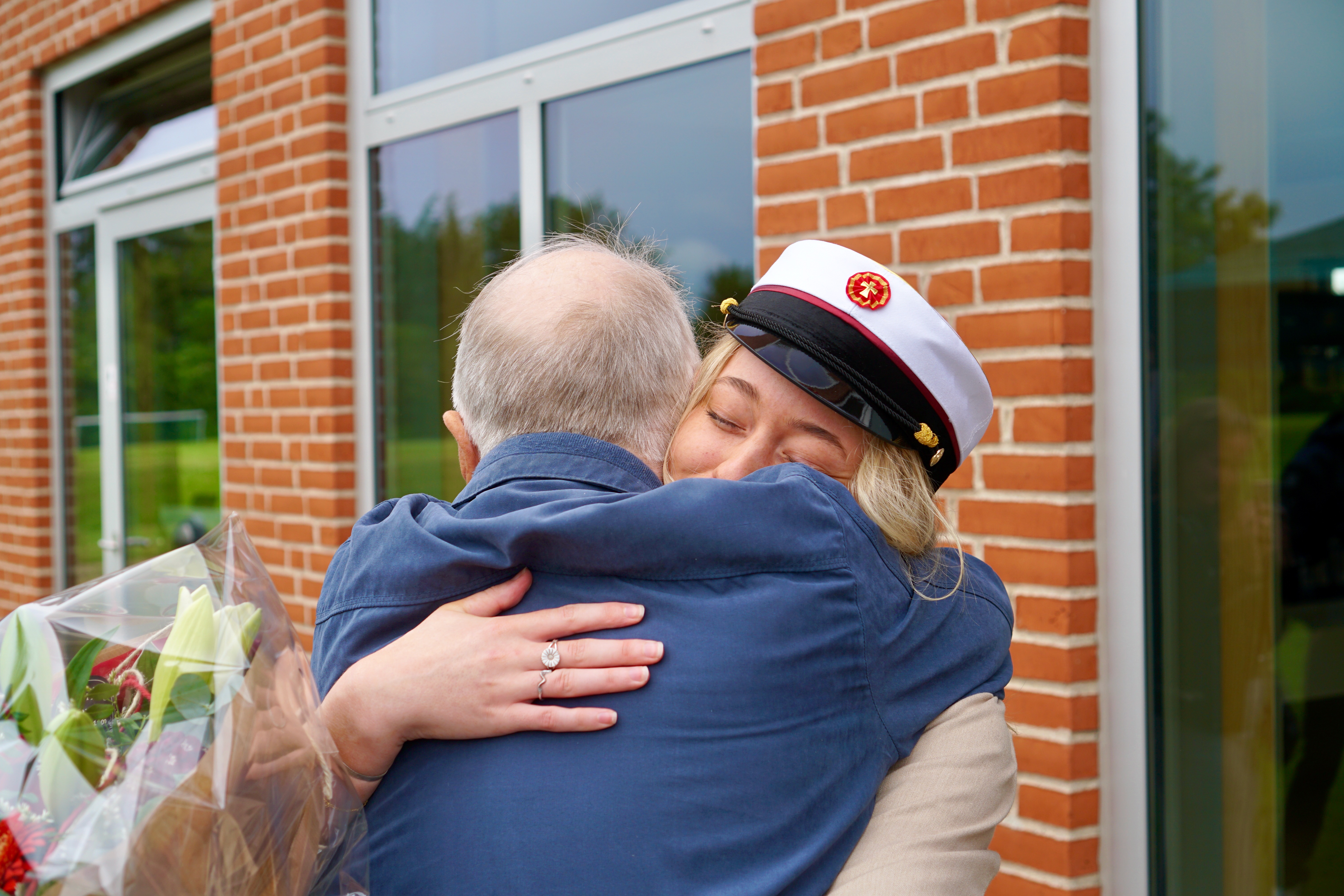 “Nu kommer de!” Råbte en af de spændte gæster, da årets første studenter drejede om hjørnet fra eksamensfløjen og med store smil tog imod jubelråb, varme knus - og en længe ventet studenterhue. De nyudklækkede studenter, Julie Louise Bisgaard Bøcker fra ...