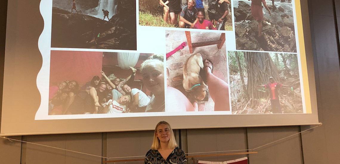 Foran et hav af farvestrålende billeder hørte eleverne i går om livet som frivillig i Zambia. I en formiddagspause havde skolen nemlig besøg af Maja Boldt Hansen, der til sin dimission i sommers modtog TGaid-legatet og dermed kunne se frem til et ophold i det afrikanske. I smukke omgivelser har hun med det øvrige hold af frivillige og ansatte blandt andet sørget for undervisning, fritidsaktiviteter og en meget livsbekræftende kontakt med de zambianske børn, om hvilke Maja fortalte: “De var vilde med os, og jeg gik altid med mindst tre børn i hænderne ad gangen.”