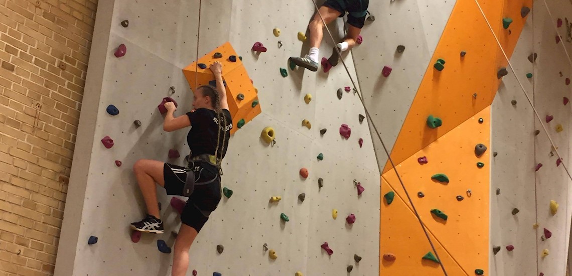 Der var langt ned, da 3.a og 3.e i sidste uge forcerede klatrevæggene på Vejle Idrætshøjskole. Som tak for at arrangere gymnasiets idrætsdag i efteråret fik de to klasser en overnatning på højskolen, hvor de - ud over at bekæmpe enhver form for højdeskræk - nåede et slag volley, tønde-race i skoven, crossfit, spinning, teambuilding og battle.