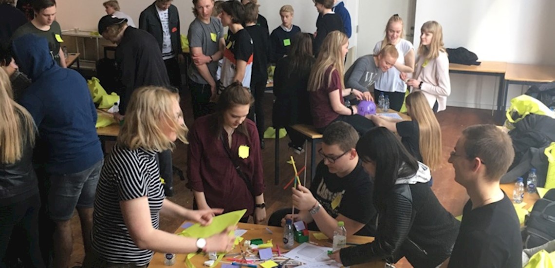 Eleverne arbejde hele eftermiddagen med idéudvikling og idégenerering sammen med studerende fra forskellige professioner samt andre gymnasielever.