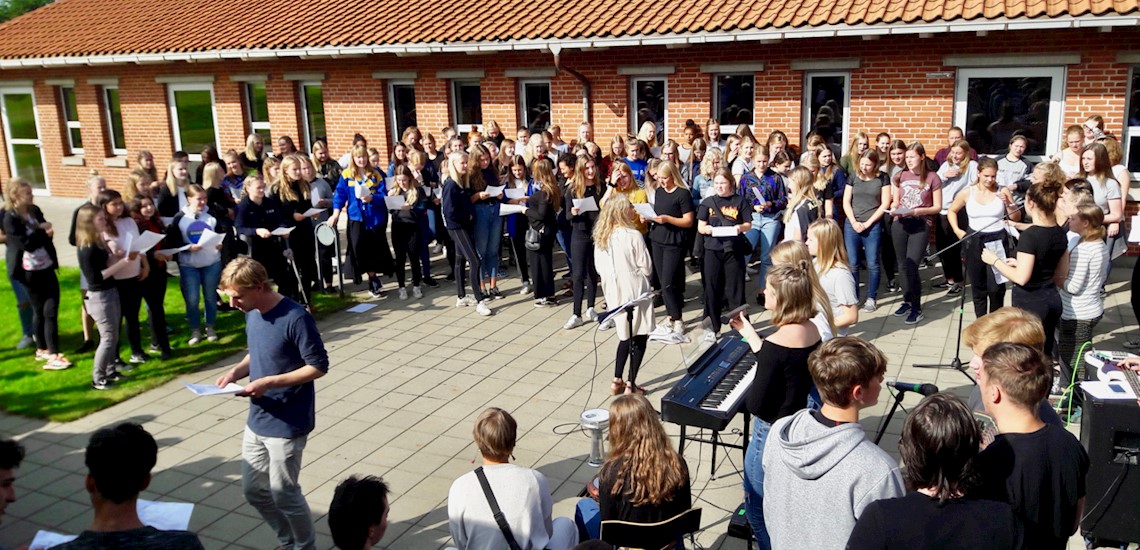 Årets måske sidste sommersol og 1.g'erne synger Ed Sheeran's "Shape of You" sammen med de ældre årganges musikelever i gården. Dejligt!
