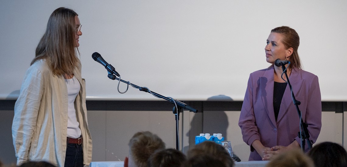 Efter en guidet tour med Tobias fra 3.d og Karoline fra 3.b bød vores rektor officielt velkommen i kantinen, hvor Mette Frederiksen også fik skolens fine sang at høre. Anført af Mikkel fra 2.a, Laura fra 3.c og Lilja fra kommende 1.d, tog eleverne ordet, og fra scenen kvitterede dagens gæst med ros for den store spørgelyst. I det hele taget gik det ikke ubemærket hen, at vi har et helt særligt sted med et varmt fællesskab og engagerede elever.